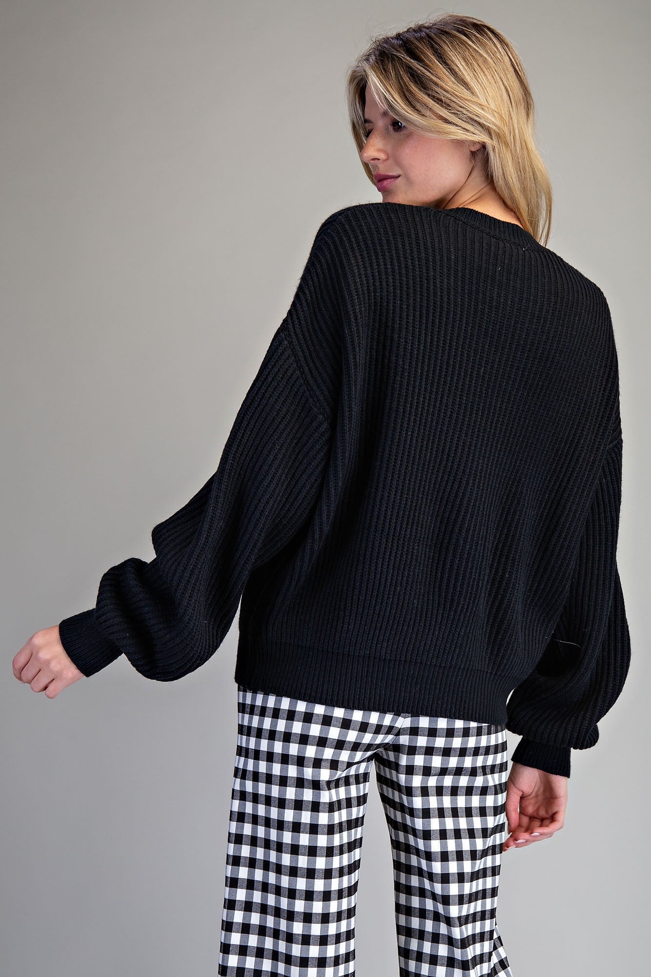 - Ribbed knit with dropped shoulders for cozy comfort